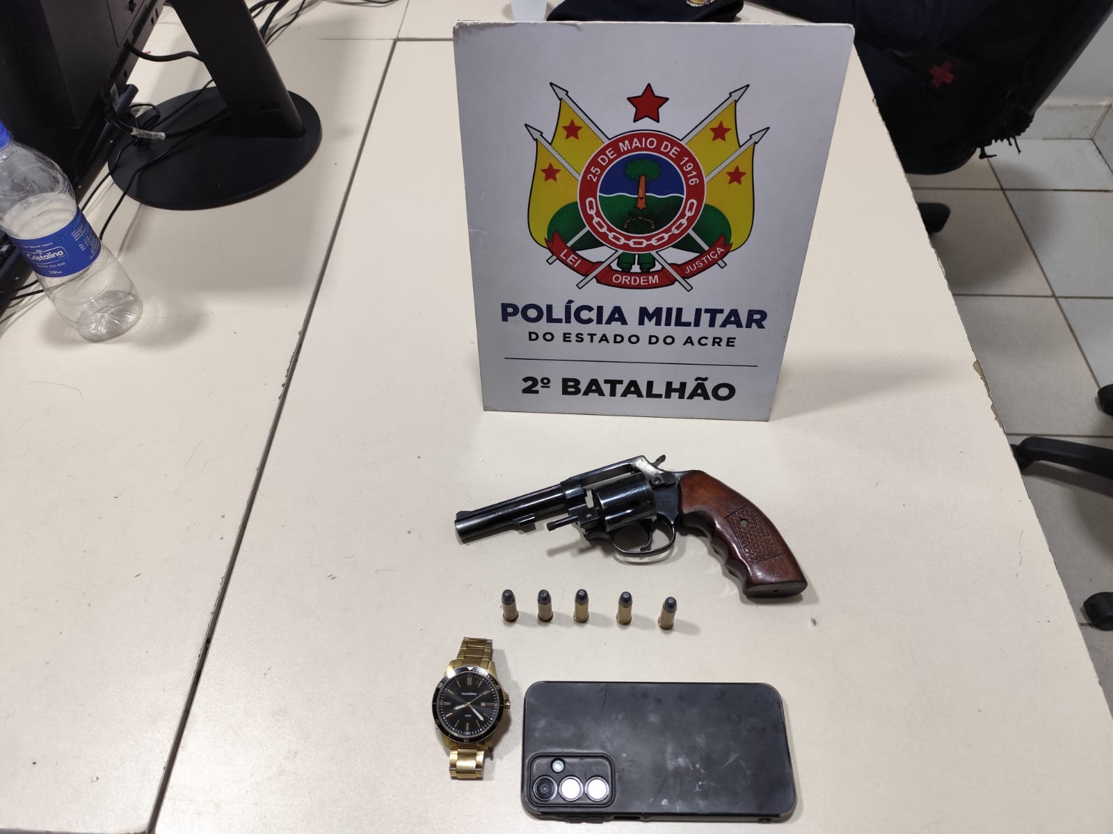 Policiais militares do 2° Batalhão prenderam, na noite desta sexta-feira (10), o vigilante Cleilton França Pessoa, de 40 anos, após ele ser flagrado embriagado e portando um revólver calibre .38 em um bar localizado na Rua Cunha Matos, bairro 6 de Agosto, região da Gameleira, em Rio Branco.