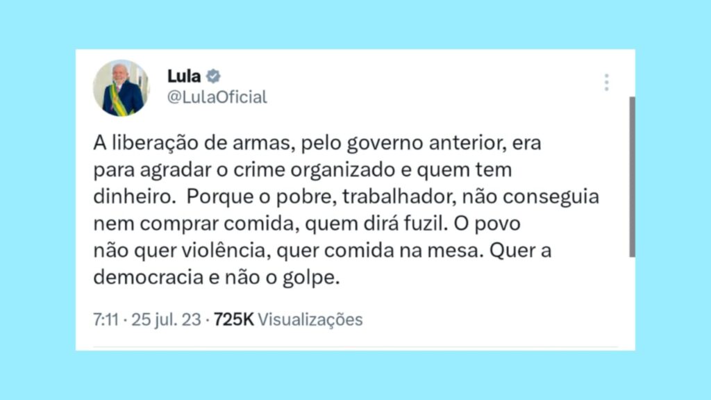 Já na terça-feira, 25, o presidente publicou que a liberação das armas, pelo governo Bolsonaro, era para agradar o crime organizado.