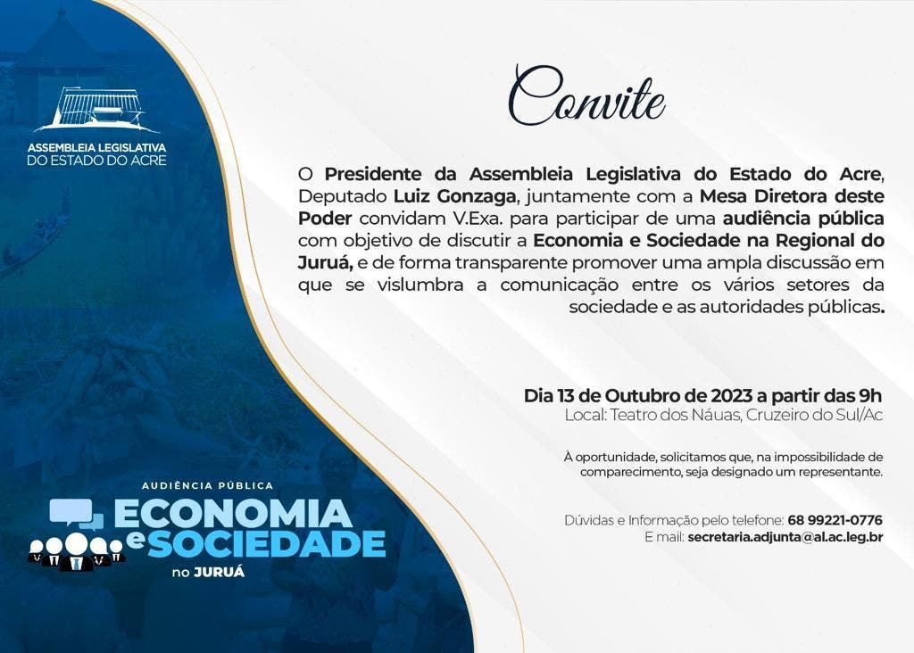 A audiência pública, marcada para o dia 13, será realizada no Teatro dos Nauás, às 9h. O encontro servirá para promover uma ampla discussão entre os vários setores da sociedade e terá como tema: Economia e Sociedade na Regional do Juruá.