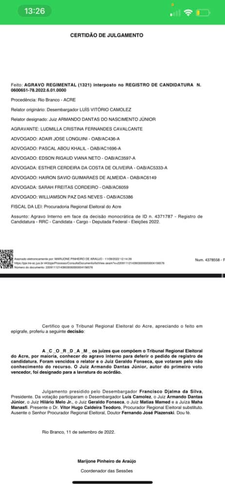 Nas redes sociais, Ludmila postou que sua candidatura foi deferida e publicou prints de documentos para comprovar.