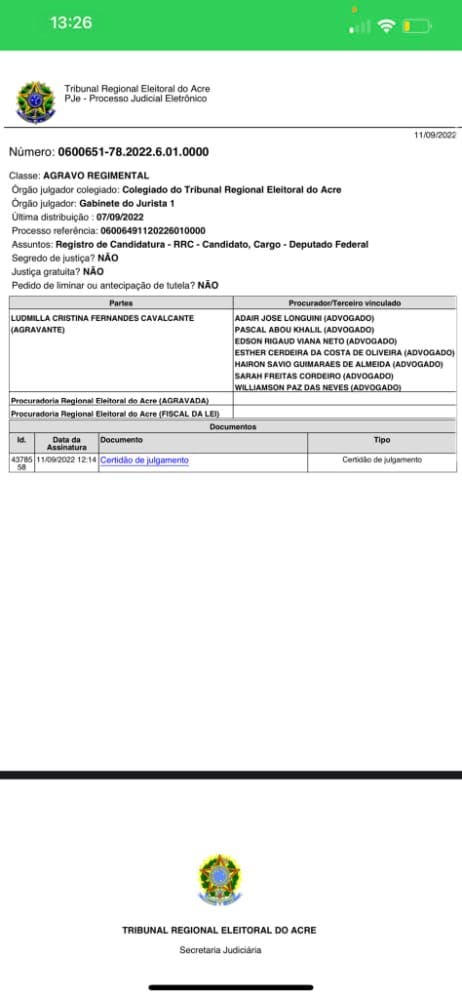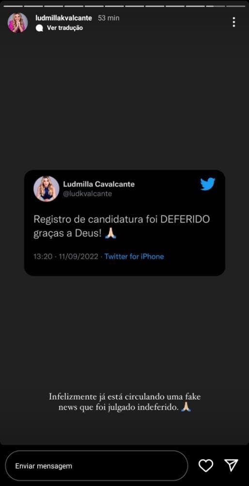 Nas redes sociais, Ludmila postou que sua candidatura foi deferida e publicou prints de documentos para comprovar.