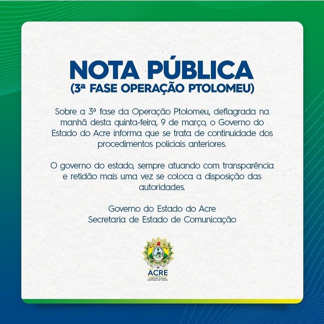 O Tribunal de Contas do Estado do Acre (TCE-AC) vem a público esclarecer o seguinte acerca da terceira fase da Operação Ptolomeu, desencadeada nesta quinta-feira, 9, pela Polícia Federal: