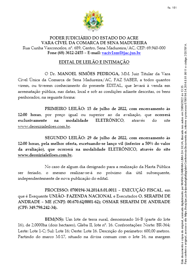 A empresa Casa do Seringueiro, que trabalha no segmento de comércio de artefatos e peças de borracha situada em Sena Madureira, que tem como proprietário o prefeito da cidade, Mazinho Serafim, vai à leilão por ordem judicial. A decisão é do juiz Manoel Simões Pedroga, titular da Vara Cível única de Sena Madureira. Ao ContilNet, o prefeito disse que as dívidas estão parceladas e que os pagamentos estão sendo feito em dia.
