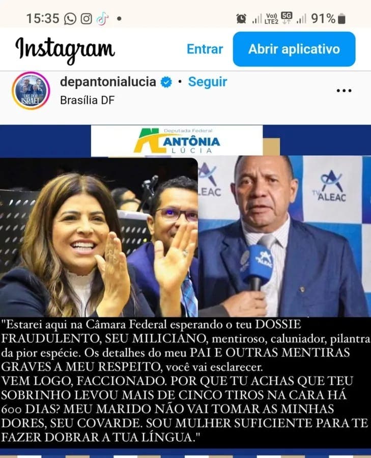 A contenda entre a deputada federal Antônia Lúcia e o deputado estadual Manoel Moraes atingiu um novo nível de acusações graves. Em uma publicação no Instagram, Antônia Lúcia não poupou palavras ao se referir a Moraes, chamando-o de “miliciano, faccionado e pilantra da pior espécie”. Além disso, ela mencionou a existência de um suposto “dossiê fraudulento” que o parlamentar estaria planejando usar contra ela, envolvendo o nome de seu falecido pai, que foi delegado do antigo território federal do Acre.