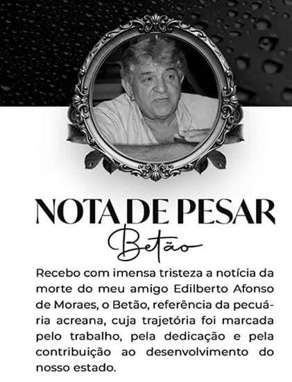 Na mensagem, Velloso ressaltou o legado que Betão deixou para o setor produtivo do estado, lembrando de sua contribuição ao fortalecer a economia acreana ao longo dos anos.