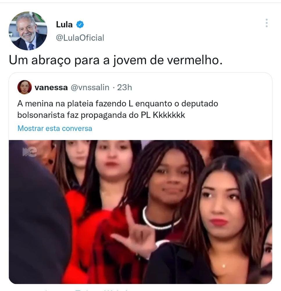 A repercussão foi tamanha que o próprio Lula retwettou em sua conta o vídeo e escreveu ‘Um abraço para a jovem de vermelho’.