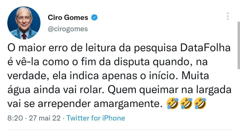 Após a divulgação, Ciro usou sua conta pessoal do Twitter para se manifestar a respeito do resultado e escreveu: