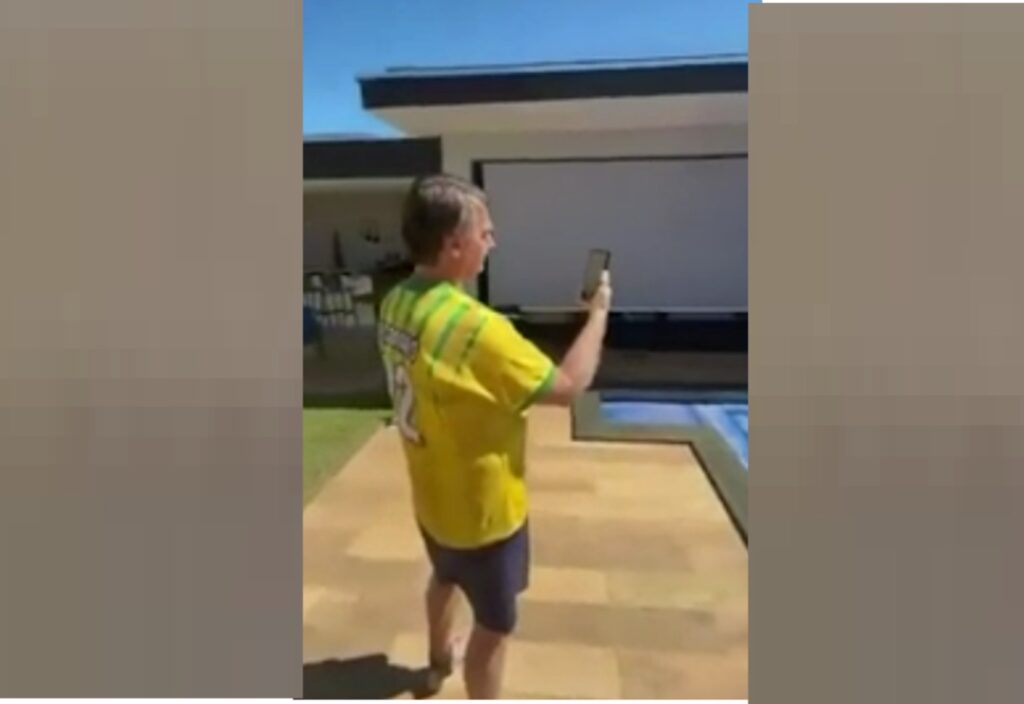 Vestindo uma camisa verde e amarela, e com a tornozeleira na perna esquerda, Bolsonaro sorri durante o vídeo enquanto olha para a tela de um celular. Em outro momento, ele acena com um sinal de ‘joia’, enquanto parece participar de uma ligação por vídeo.