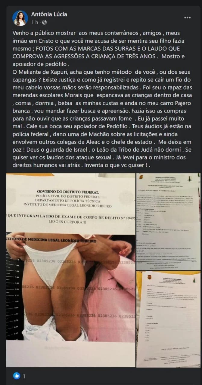 Além das fotos, Antônia Lúcia fez acusações graves contra o atual marido de sua filha, Gabriela Câmara, que ocupa o cargo de presidente do Iteracre. Em uma postagem no Instagram, a deputada não poupou palavras ao chamar Cristian de pedófilo e afirmar que o empresário não só espancava as netas, como também a obrigava a realizar compras para evitar que as crianças passassem fome.