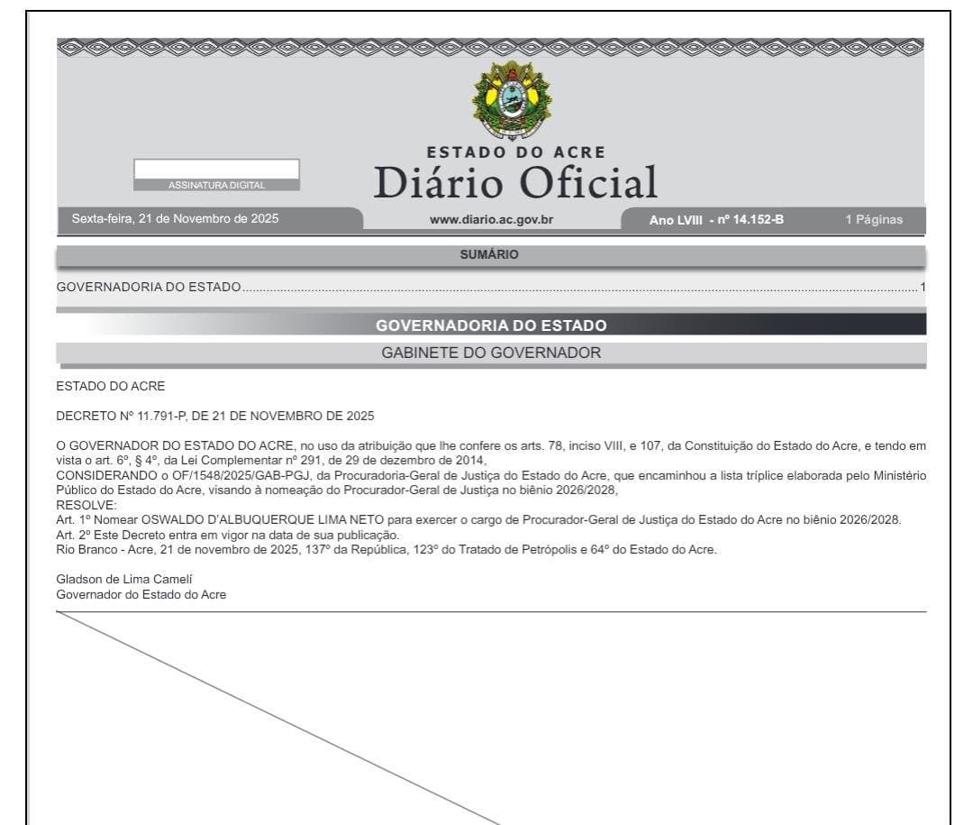 Rio Branco, AC – O governador Gladson Cameli anunciou nesta sexta-feira, 21,, a nomeação do procurador de justiça Oswaldo D’albuquerque Lima Neto para o cargo de Procurador-Geral de Justiça do Ministério Público do Acre (MPAC) para o biênio 2026/2027. A decisão foi oficializada por meio de decreto publicado em edição extra do Diário Oficial.