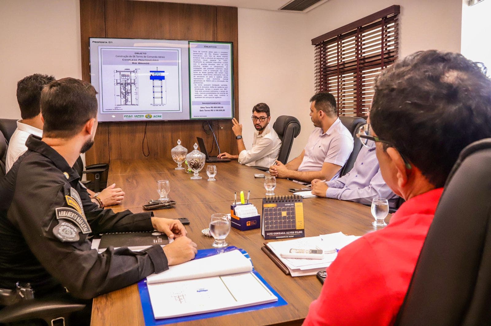 O presidente da Assembleia Legislativa do Acre (Aleac), deputado estadual Luiz Gonzaga, recebeu nesta segunda-feira (23) o presidente do Instituto de Administração Penitenciária do Acre (Iapen), Alexandre Nascimento, e representantes da Polícia Penal para tratar sobre investimentos para reforçar a segurança e proporcionar melhores condições de trabalho nos presídios acreanos.