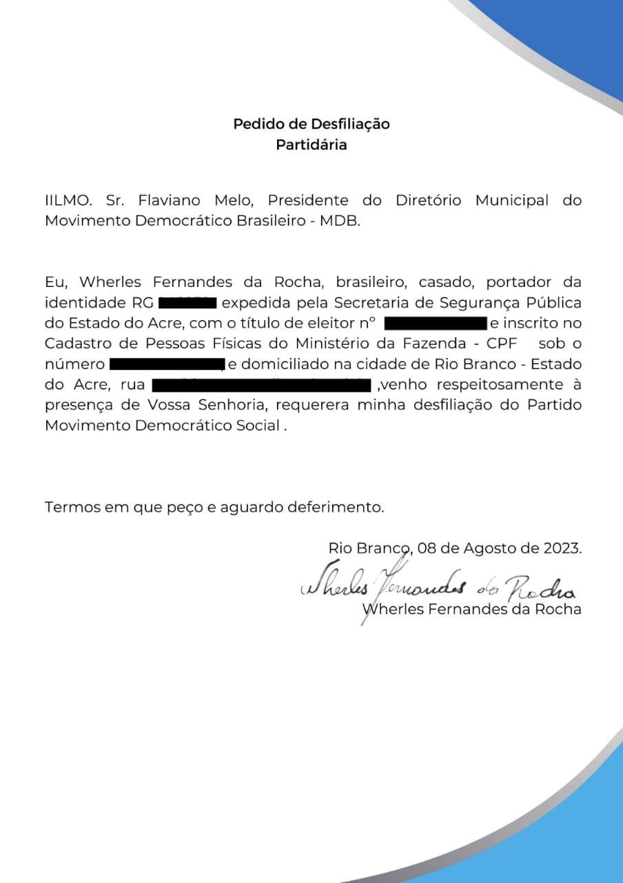 “Olá, amigos. Hoje pedimos a nossa desfiliação do Movimento Democrático Brasileiro – MDB. Entendemos o desejo da sigla em caminhar com os partidos da esquerda, tanto nacional como ao nível de Acre. Não sendo esse o nosso desejo, por coerência e por acreditar que temos que avançar e não retroceder, é que estamos nos desfilando. Queremos publicamente agradecer ao MDB e seus filiados, que nos receberam e que nos cederam a sigla partidária para que pudéssemos participar do pleito de 2022”, escreveu Major Rocha e Mara em suas redes sociais, mas sem direcionar críticas a Alexandre.