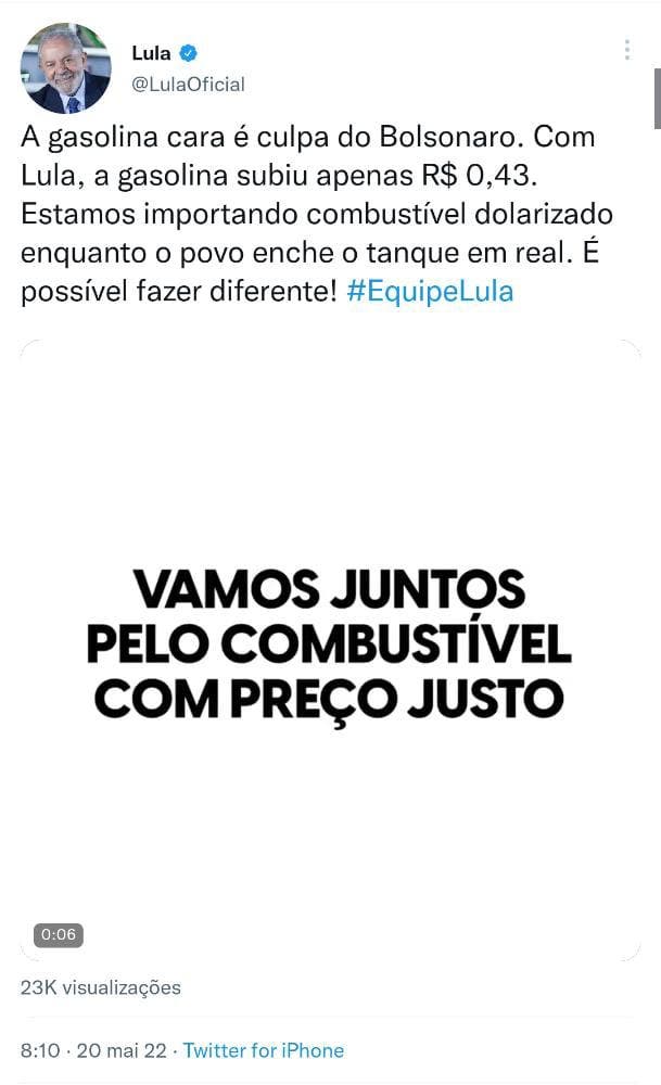 Na manhã desta sexta-feira, 20, Lula escreveu em seu Twitter que “a gasolina cara é culpa do Bolsonaro. Com Lula, a gasolina subiu apenas R$ 0,43. Estamos importando combustível dolarizado enquanto o povo enche o tanque em real. É possível fazer diferente!”.