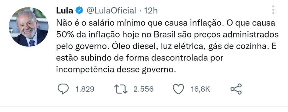 Em publicações em seu perfil, Lula afirma, ainda, que não é o salário mínimo que causa inflação. “O que causa 50% da inflação hoje no Brasil são os preços administrados pelo governo. Óleo diesel, luz elétrica, gás de cozinha. E incompetência desse governo”, dispara.