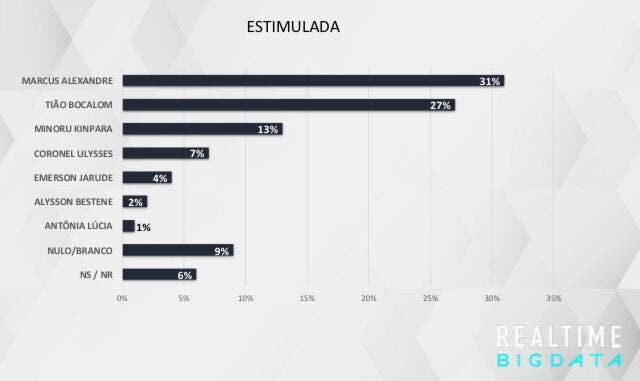 Na pesquisa, Marcus Alexandre, que já foi prefeito de Rio Branco, está na frente com 31% dos votos. O atual prefeito da cidade, Tião Bocalom, é o segundo colocado com 27% dos votos. Minoru Kinpara, Coronel Ulysses, Emerson Jarude, Alysson Bestene e Antônia Lúcia também estão concorrendo, mas receberam menos votos.