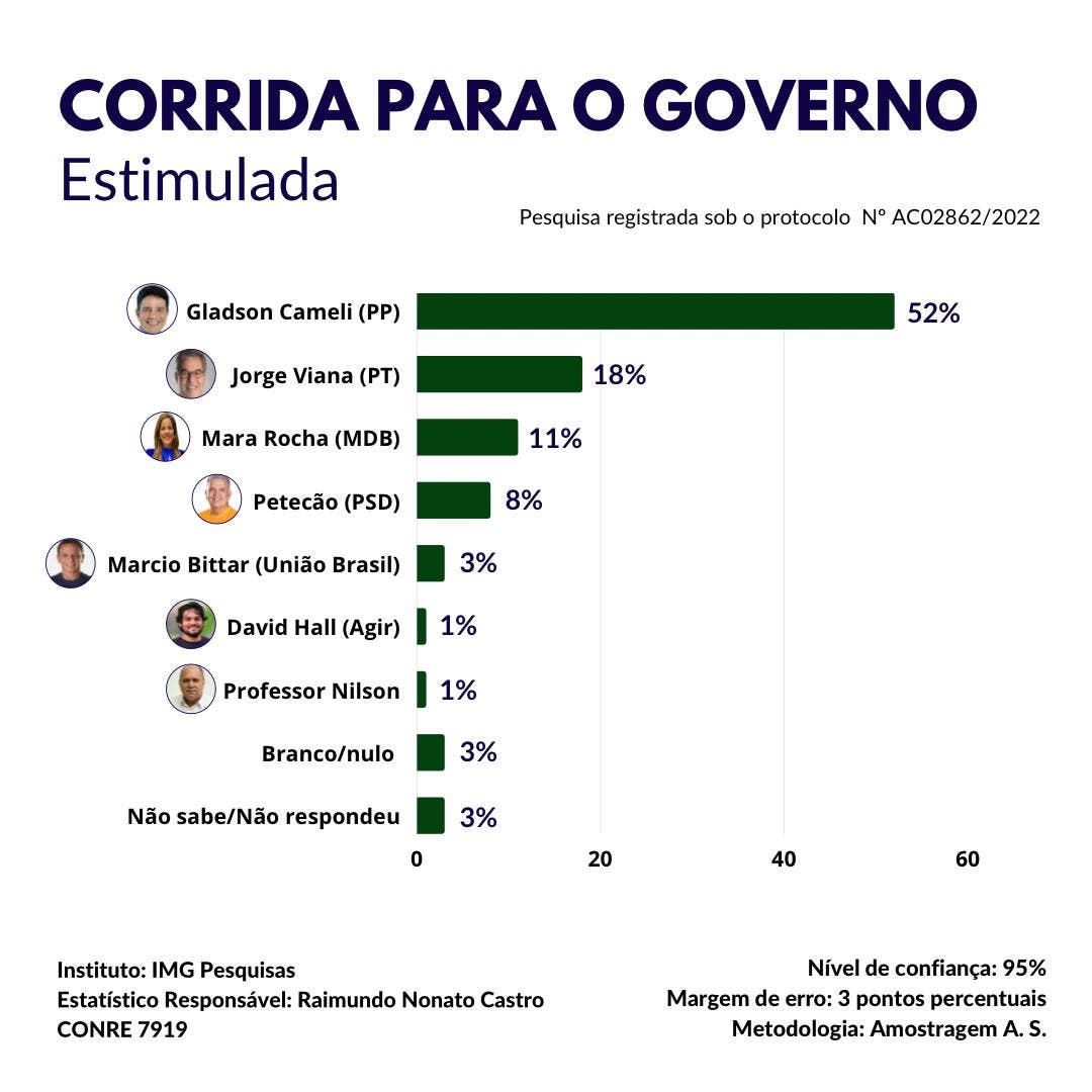 Na corrida para o senado, Alan Rick (União Brasil) e Ney Amorim (Podemos) estão tecnicamente empatados na margem de erro, que é de três pontos percentuais para mais ou para menos.