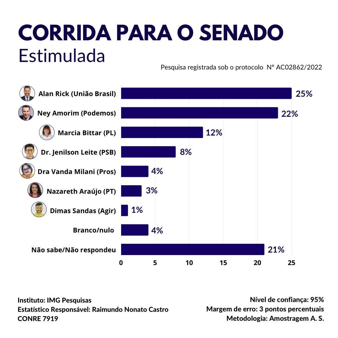 Na corrida para o senado, Alan Rick (União Brasil) e Ney Amorim (Podemos) estão tecnicamente empatados na margem de erro, que é de três pontos percentuais para mais ou para menos.