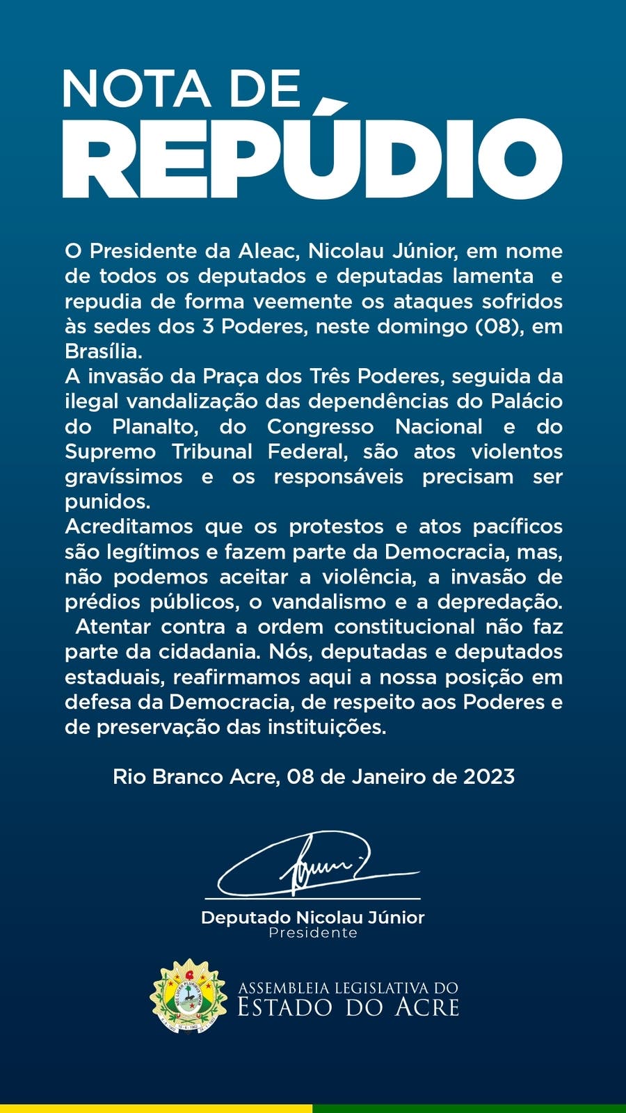 O Presidente da Aleac, Nicolau Júnior, em nome de todos os deputados e deputadas lamenta e repudia de forma veemente os ataques sofridos às sedes dos 3 Poderes, neste domingo (08), em Brasília.