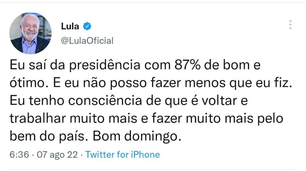 No domingo ele frisou aos seus seguidores que saiu da presidência com o percentual de 87% de bom e ótimo.