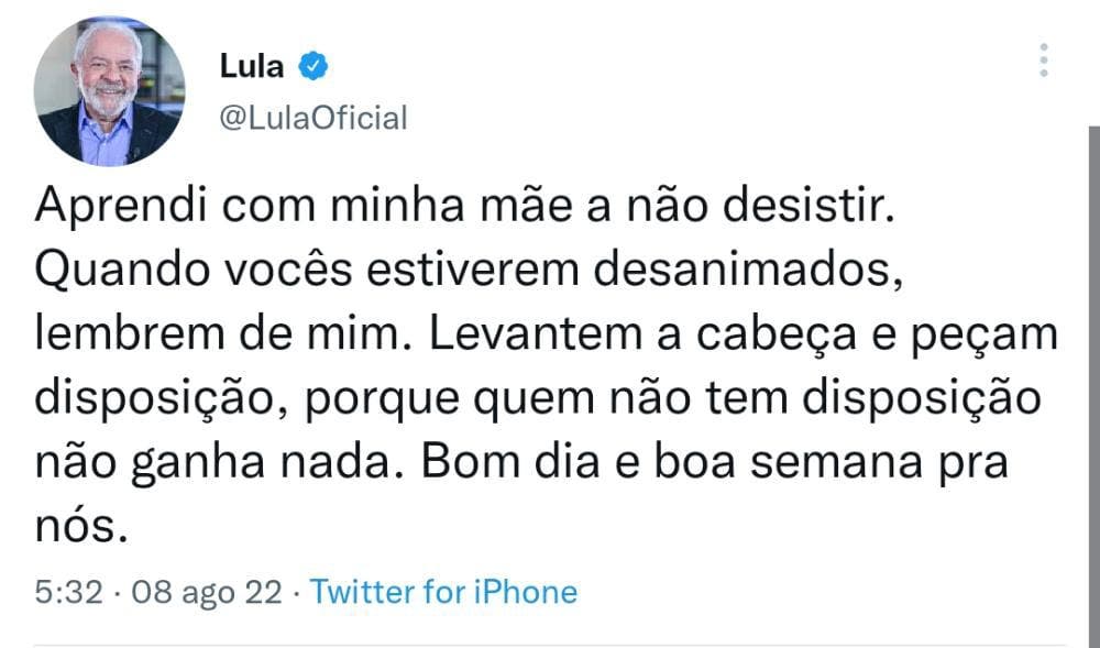 O ex-presidente Luiz Inácio Lula da Silva, do Partido dos Trabalhadores (PT) vem usando suas resdes sociais como forma de palaque eleitoral e nelas emite sempre opiniões sobre o atual cenário brasileiro e o que pretende fazer, caso venha a ser eleito.