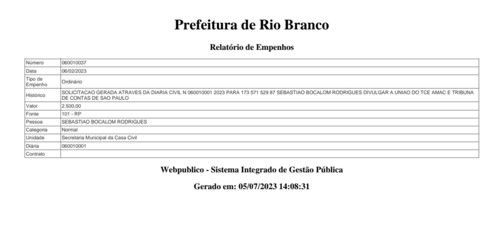 A reportagem entrou em contato com a assessoria de comunicação da prefeitura para confirmar a veracidade do documento, que consta uma diária de R$ 2.500,00 para Bocalom, mas até a publicação deste material não obteve retorno.