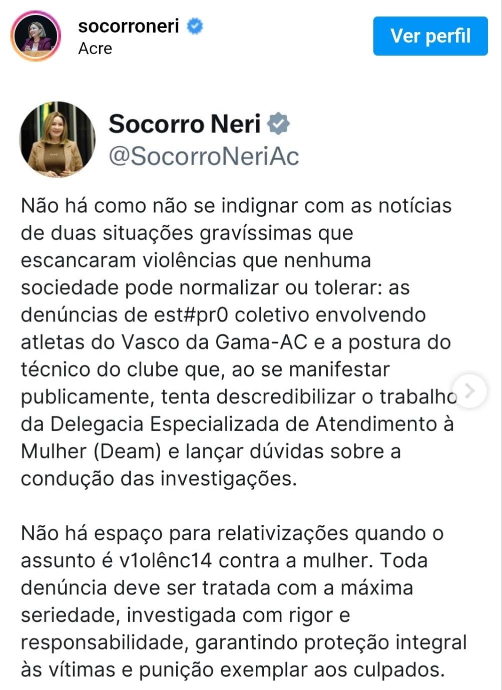 BRASÍLIA (DF), 18 de fevereiro de 2026 — A deputada federal Socorro Neri (Progressistas) fez pronunciamento público na terça-feira (17) repudiando as denúncias de estupro coletivo envolvendo atletas do Vasco da Gama-Atlético Clube e condenando a postura do técnico do time, que teria tentado descredibilizar a atuação da Delegacia Especializada de Atendimento à Mulher (Deam) nas investigações.