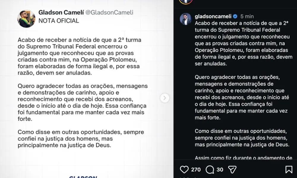 Rio Branco, AC — O governador do Acre, Gladson de Lima Camelí, reagiu na noite desta sexta-feira (20) ao julgamento da Segunda Turma do Supremo Tribunal Federal (STF), que decidiu por maioria anular todas as provas produzidas na Operação Ptolomeu contra ele e outros investigados. Em nota oficial publicada nas redes sociais, Camelí afirmou ter recebido a decisão com serenidade e destacou que a Corte reconheceu a ilegalidade das provas utilizadas na investigação.