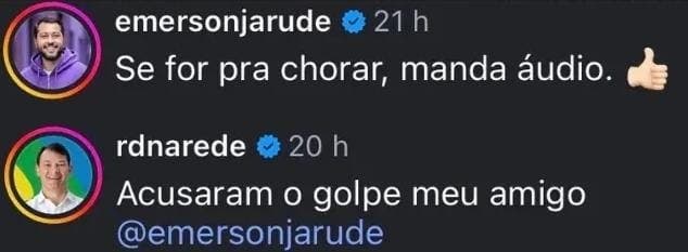 A resposta da oposição não tardou. Emerson Jarude, conhecido por sua atuação nas redes sociais, respondeu com ironia nos comentários de uma publicação no Instagram: “Se for pra chorar, manda áudio.” Roberto Duarte, presidente estadual do Republicanos, endossou a resposta do aliado, comentando: “Acusaram o golpe, meu amigo.”