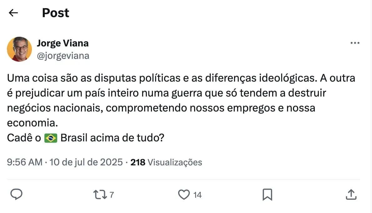 Em tom irônico, Viana questionou o lema bolsonarista “Brasil acima de tudo”, argumentando que as disputas políticas não devem prejudicar a economia nacional e comprometer empregos. Sua publicação no X (antigo Twitter) destaca a preocupação com os impactos negativos das tarifas americanas sobre os negócios e a economia brasileira, contrapondo a retórica nacionalista com a realidade de prejuízos concretos para o país.