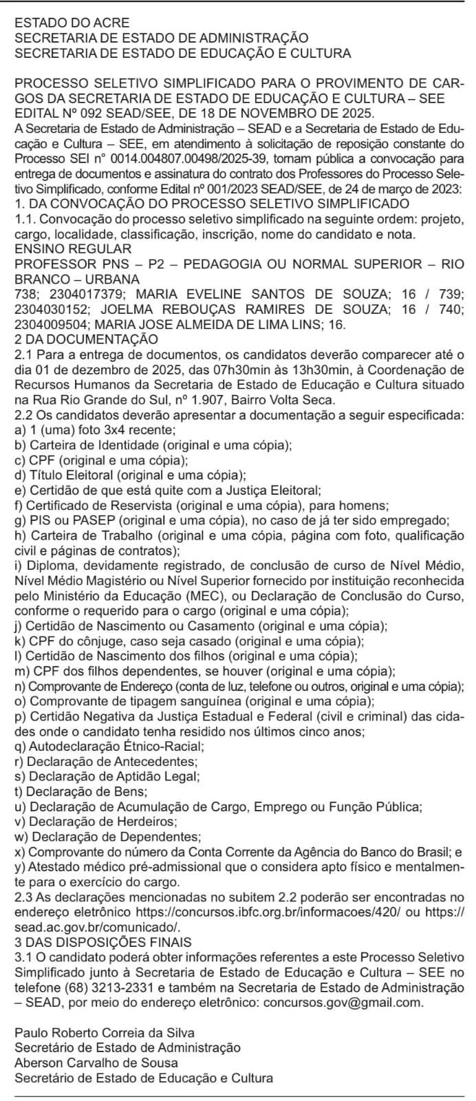 Rio Branco, AC – A Secretaria de Estado de Administração (SEAD) e a Secretaria de Estado de Educação e Cultura (SEE) anunciaram a convocação de novos professores aprovados no Processo Seletivo Simplificado, conforme Edital nº 092/2025, publicado no Diário Oficial do Estado (DOE) desta sexta-feira, 21.