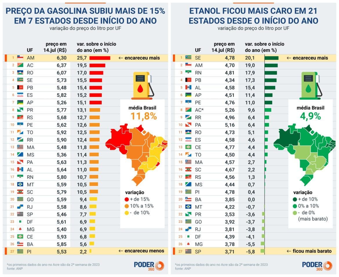 Com isso, o Acre, assim como como 12 estados brasileiros, ficou acima da média nacional, que é de 11,8%. Já em relação ao valor do etanol, o Acre ficou em 8º lugar com um aumento de 9,6%. Além disso, a média nacional é de 4,9% e 11 estados ficaram acima dessa média. Inclusive, os estados do Mato Grosso, Paraná, Goiás, Rio de Janeiro, Distrito Federal, Minas Gerais e São Paulo são os estados com o etanol mais barato do Brasil.