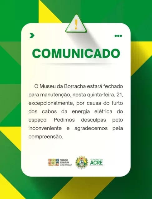 O Museu da Borracha, em Rio Branco, que foi inaugurado no dia 17 de agosto, não pôde abrir ao público nesta quinta-feira, 21, porque vândalos roubaram os fios elétricos do local.