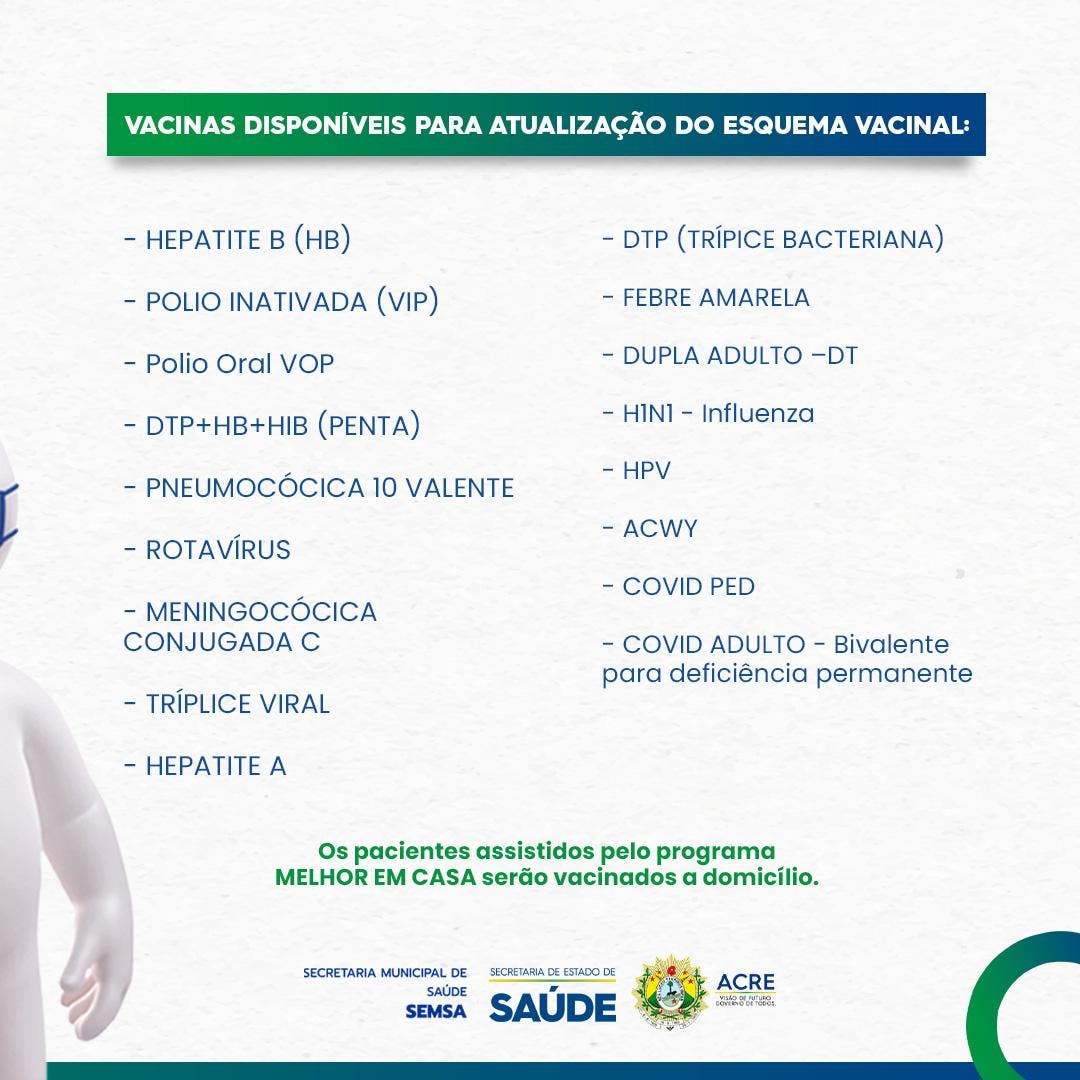 O governo do Acre, por meio do Programa Nacional de Imunização (PNI) da Secretaria de Estado de Saúde (Sesacre), estará ofertando neste fim de semana 4 e 5 de maio, 17 tipos de vacinas para pessoas com deficiência.