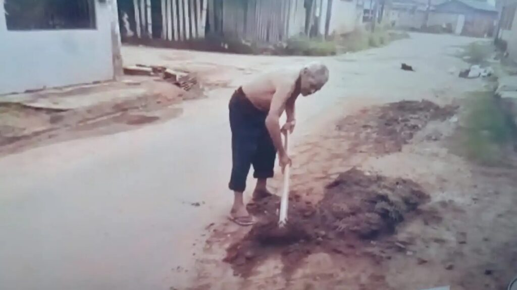 Seu Emídio é um dos idosos mais conhecidos no bairro João Eduardo II, não só pelos seus 87 anos, mas também pelo vigor físico. Vez por outra é visto fazendo algum tipo de trabalho pesado para sua idade já avançada. Nessa semana, ele foi flagrado quando tapava com barro dezenas de buracos que tomam conta da rua em que ele mora.