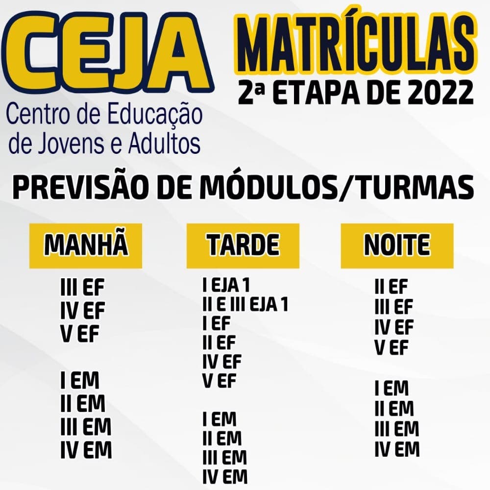 O Centro de Educação de Jovens e Adultos (CEJA) estará com as matrículas abertas, a partir da próxima segunda-feira, 8, para o público que tem interesse em concluir o ensino fundamental e médio.