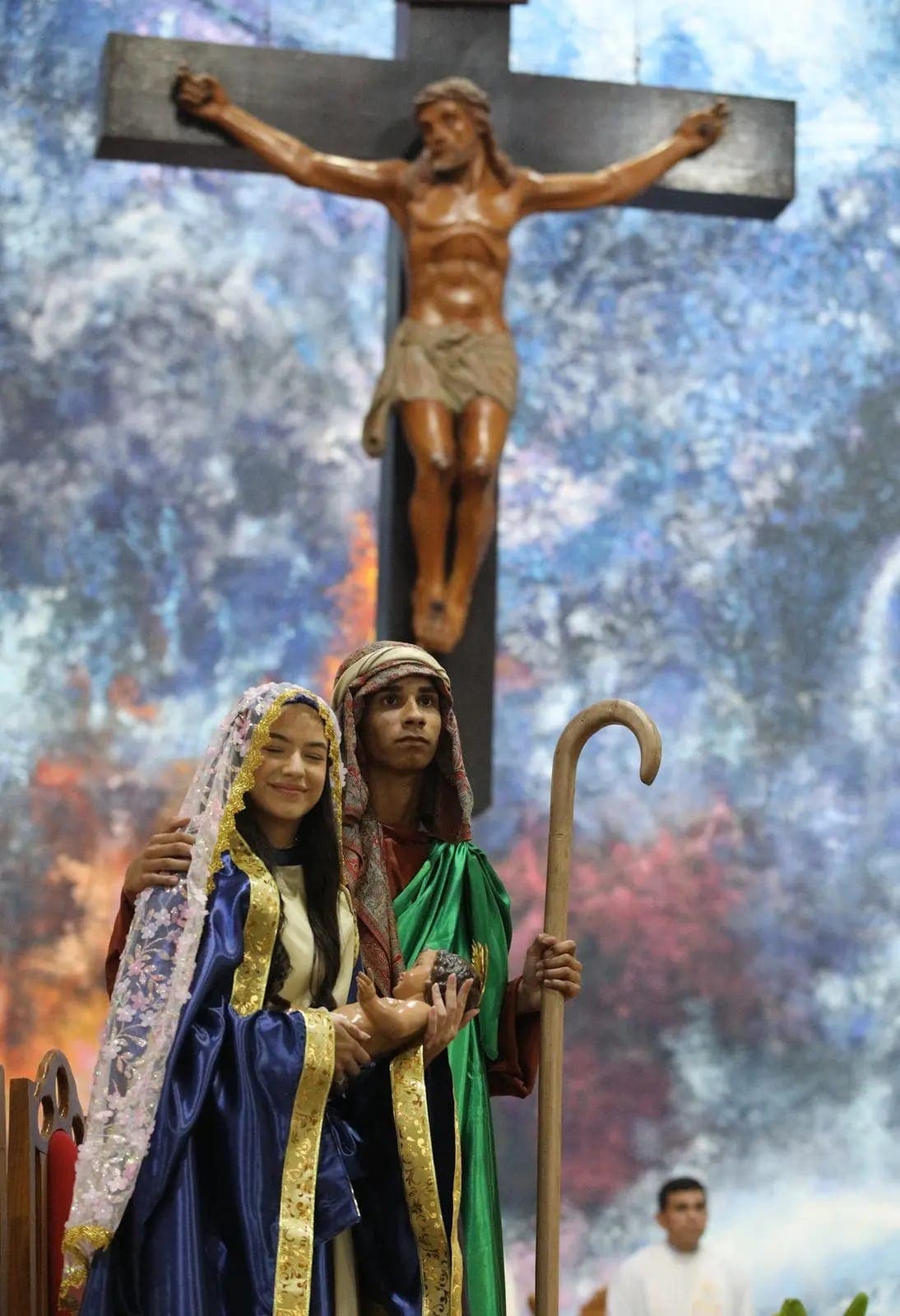 Um dos momentos mais marcantes da missa foi a encenação com Maria, José e o Menino Jesus, levado até a manjedoura montada no altar — símbolo do nascimento de Cristo. Em seguida, o padre Manoel Costa realizou o cântico da proclamação do Natal.