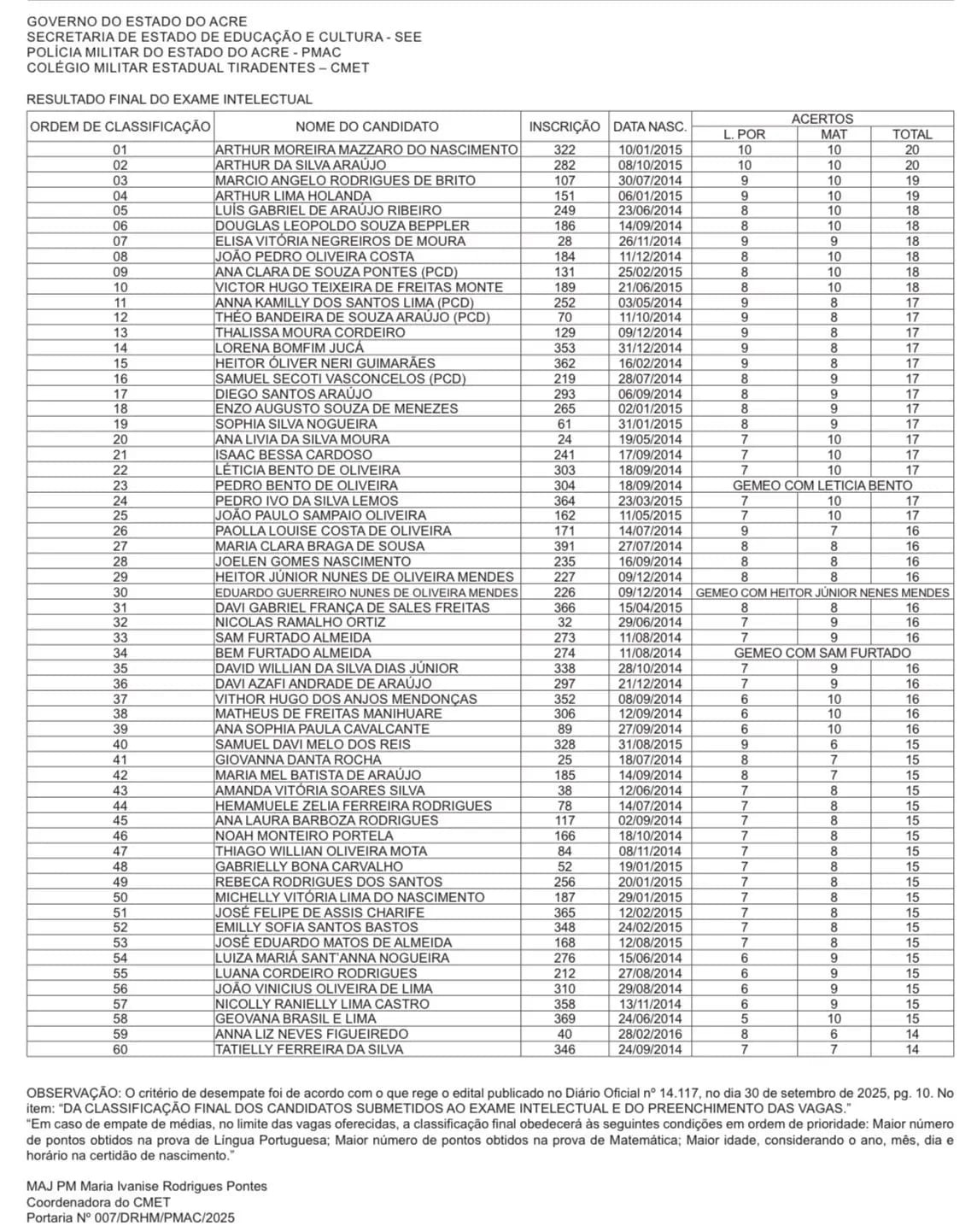 A relação completa com nomes, pontuações e classificações está disponível nos canais oficiais do CMET. A coordenação do processo seletivo é da major PM Maria Ivanise Rodrigues Pontes, conforme portarias da PMAC.