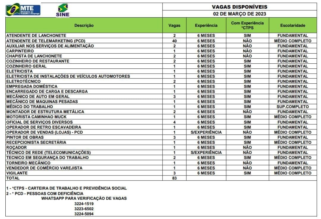 Para quem já possui cadastro e tem interesse em umas das vagas, podem entrar em contato por meio do Whatsapp nos números: (68) 3223-6502; (68) 3224-5094; (68) 3224-1519 ou 0800 647-8182.
