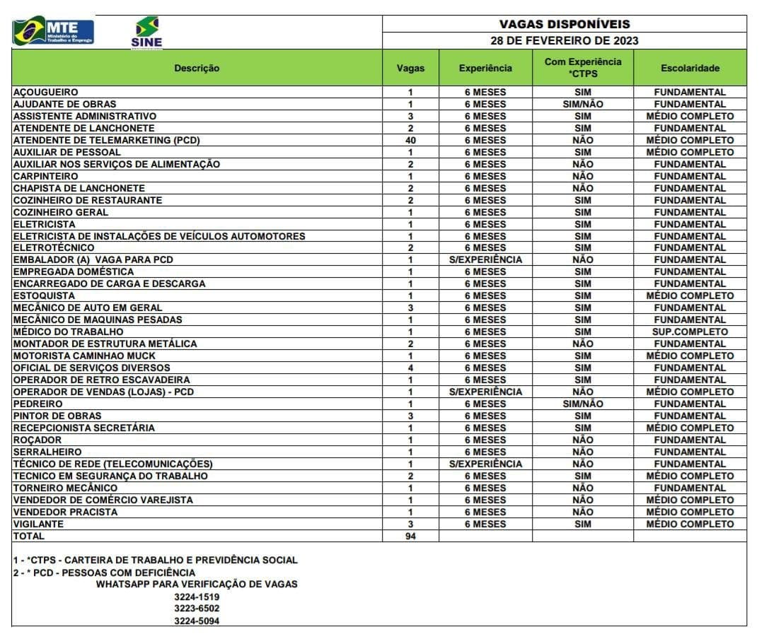 O Sistema Nacional de Emprego do Acre (Sine), está ofertando 94 vagas de emprego para esta terça-feira, 28. Dessas, 38 são para quem possui nível fundamental, 55 para nível médio e uma para nível superior completo. Além disso, 42 destas vagas são destinadas para pessoa com deficiência (pcd).