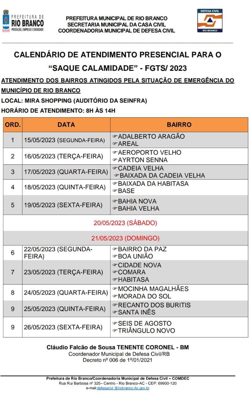 A Defesa Civil de Rio Branco inicia nesta segunda-feira, 15, no Mira Shopping (auditório da Secretaria de Infraestrutura e Mobilidade Urbana – Seinfra), das 8h às 14h, o atendimento presencial para que famílias atingidas pela enchente façam o “saque calamidade”.