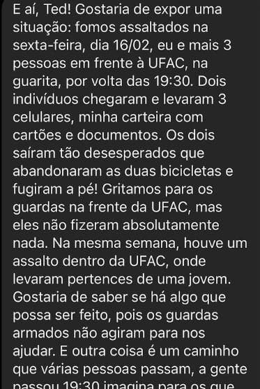 Essa denúncia também mencionou outro assalto que teria ocorrido nas dependências da universidade na mesma semana, onde a vítima teve seus pertences levados. Esses incidentes levantam questões sobre a segurança no campus da Ufac e a assistência oferecida aos estudantes.