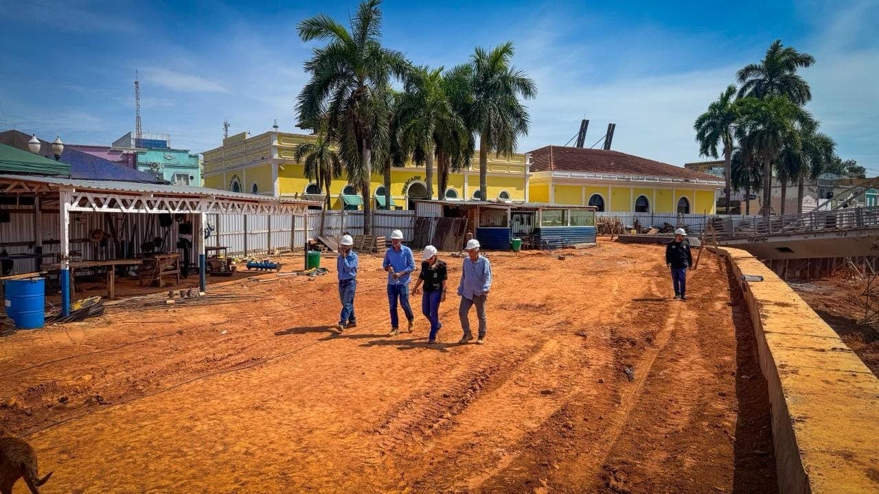 Também foi concluído o reforço do solo, que deixa a base da passarela mais firme, e os técnicos montam a estrutura que apoia a parte superior da passarela, garantindo que o tabuleiro fique alinhado e seguro. Em breve, começarão os serviços de drenagem e aterro na área frontal do calçadão, no entorno do Mercado Velho. O trabalho vai melhorar o escoamento da água da chuva e deixar o terreno mais firme e seguro para pedestres e comerciantes.