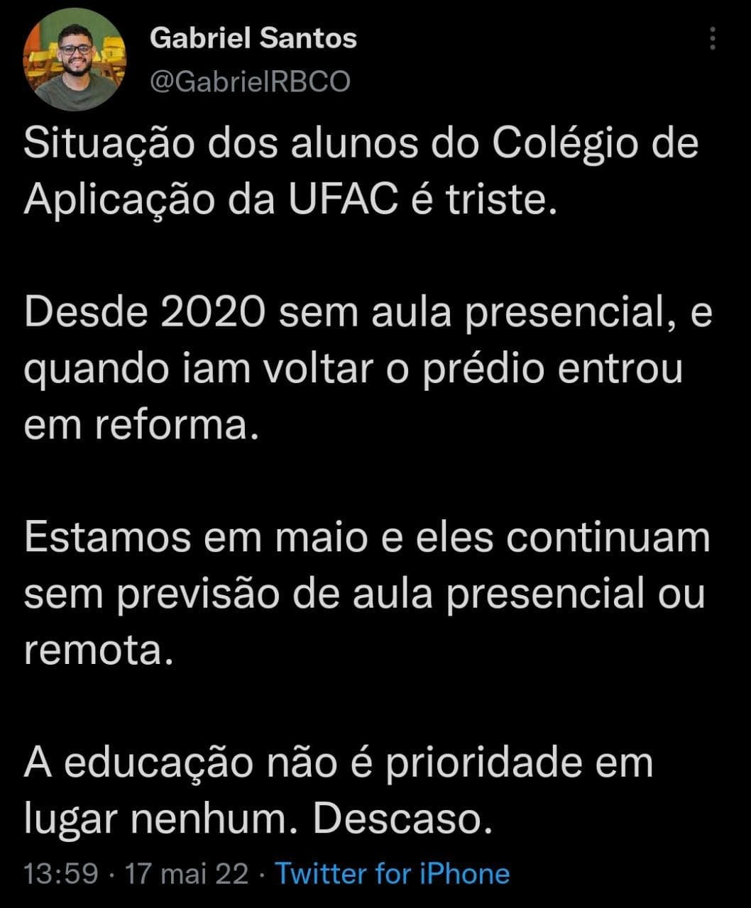 A situação também foi relatada no perfil das redes sociais do advogado Gabriel Santos que escreveu que “a educação não é prioridade em lugar nenhum”.