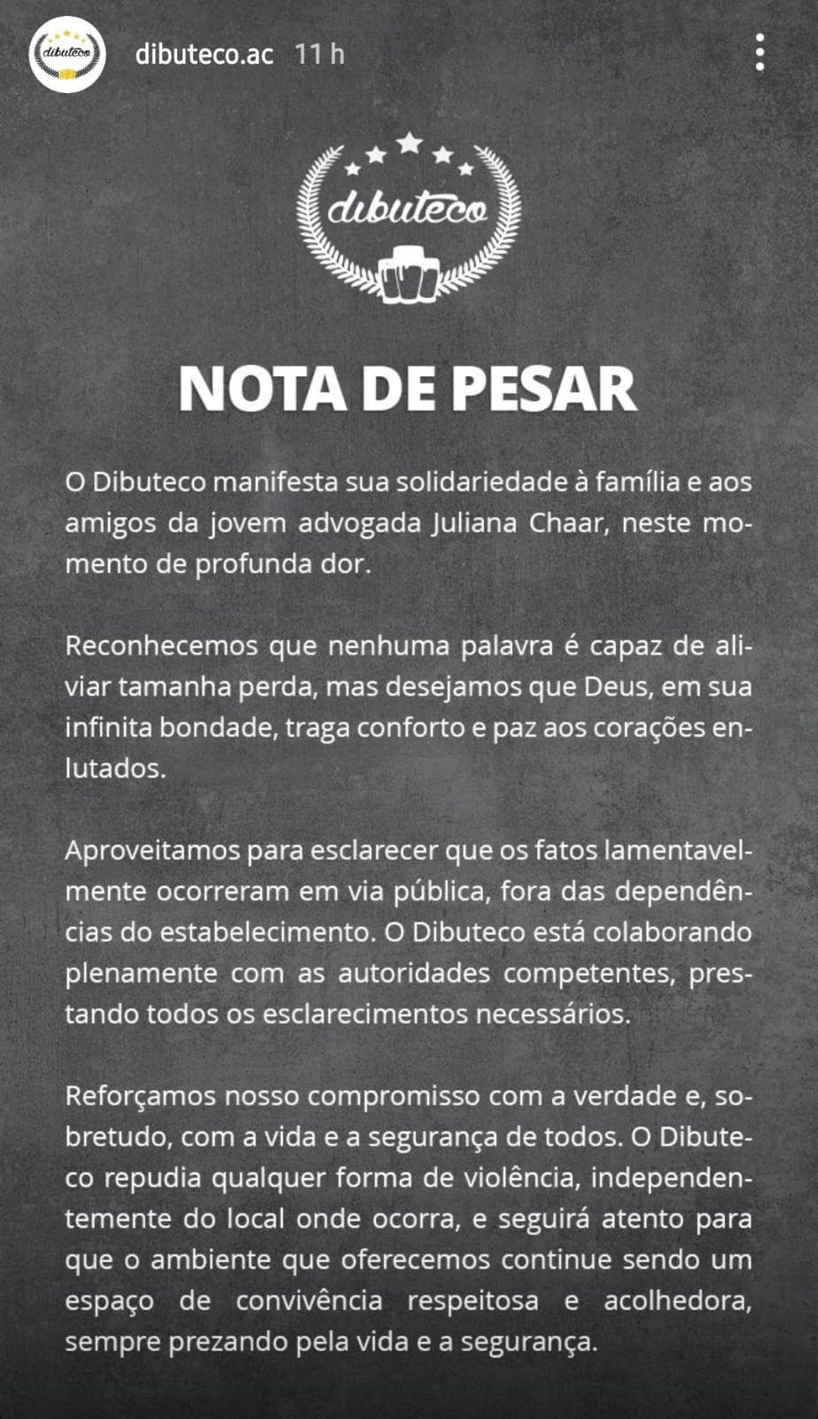 O Dibuteco, casa noturna de Rio Branco, emitiu nota de pesar pela morte da advogada Juliana Chaar Marçal, 36 anos, vítima de atropelamento intencional na madrugada de sábado (21). A nota, publicada no Instagram, expressa profunda solidariedade à família e amigos de Juliana, reconhecendo a imensurável perda e oferecendo condolências.