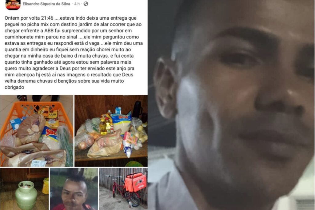 “Ele me deu uma quantia em dinheiro e fiquei sem reação. Chorei muito ao chegar na minha casa, debaixo de muita chuva, e contar quanto tinha ganhado. Estou até agora sem palavras, mas quero muito agradecer a Deus por ter enviado este anjo para me abençoar”, escreveu Alexsandro mostrando imagens com as compras que fez com a benção que recebeu.