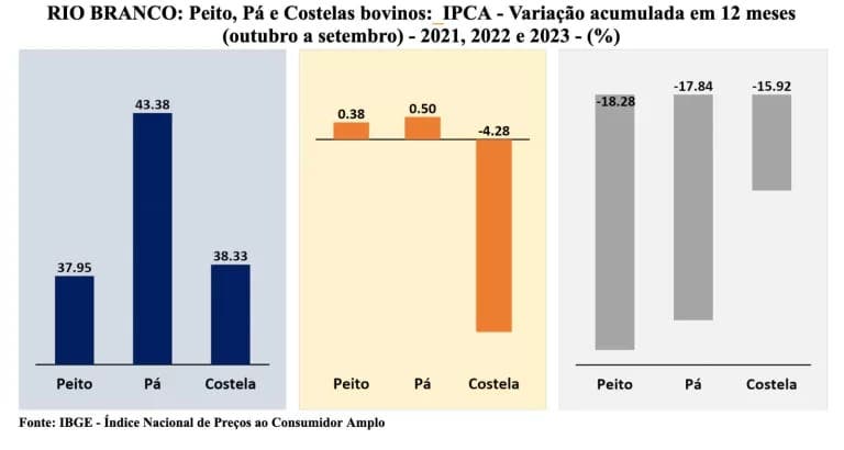 De acordo com o gráfico, o preço da carne bovina em Rio Branco teve uma queda significativa nos últimos 12 meses. Enquanto o índice geral teve uma variação negativa de -0,24%, a carne bovina teve uma queda ainda maior. O grupo de Alimentação e Bebidas, por sua vez, teve um crescimento de 5,29% no mesmo período.