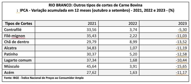 Em 2022, houve quedas em todos os principais tipos de cortes de carne bovina, como mostrado na tabela. O contrafilé teve a menor redução de preço, de 5,30%. A parte mais cara do gado caiu quase o dobro do que a parte mais barata (11,3%). Chama a atenção também a diminuição dos músculos em 15,65% e da chã de dentro em 13,52%.