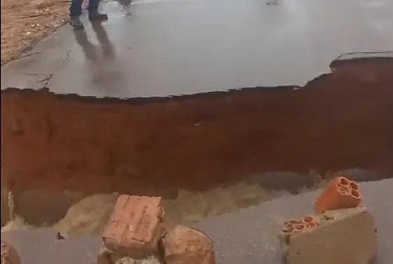 Imagens registradas por um morador e compartilhadas nas redes sociais mostram a força da água avançando sobre a asfalto, invadindo o solo abaixo e abrindo uma cratera que comprometeu totalmente a estrutura da rua. Devido ao risco, o tráfego de veículos foi suspenso no local.