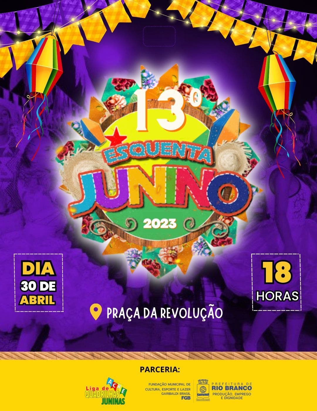 O pontapé oficial para o início da temporada do São João 2023 será dado no próximo domingo, 30, a partir das 18h, na Praça da Revolução, Centro de Rio Branco, com o Esquenta Junino.
