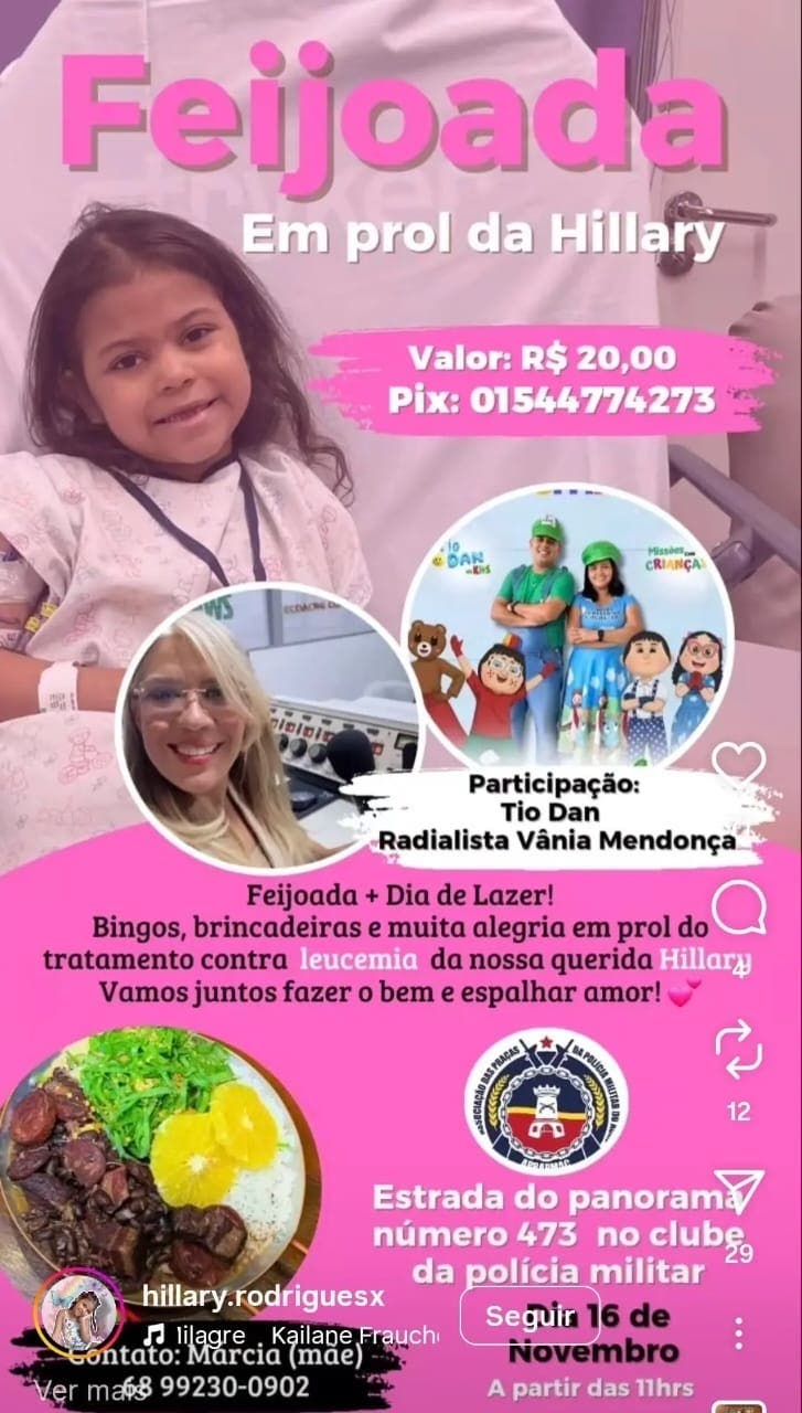 Diagnosticada em março deste ano, Hillary enfrenta uma rotina desafiadora de cuidados e viagens para São Paulo, onde recebe tratamento especializado. A família tem se dedicado integralmente à sua recuperação, e a feijoada surge como uma importante iniciativa para aliviar os custos financeiros associados ao tratamento.